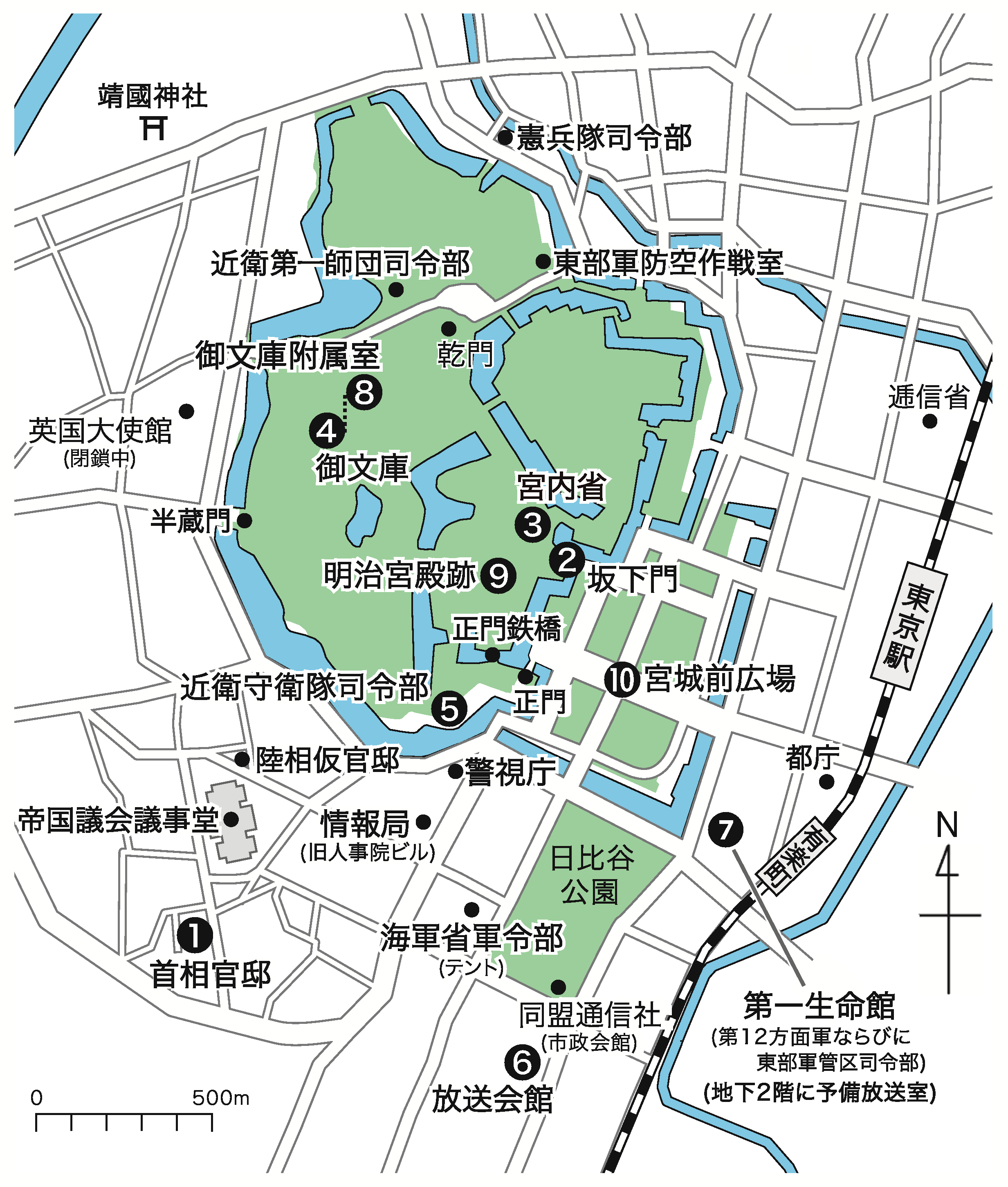 陸軍の青年将校らが宮城を一部占拠し、録音盤の奪取と木戸・石渡両大臣の捕縛を企てます。録音帰りの総裁はじめ運転手を含む16名は、坂下門を出られず、翌朝まで二重橋畔の衛兵詰所に拘束監禁されます。この顛末は林茂の『日本終戦史』、下村海南(宏)の『終戦秘史』や半藤一利の『日本のいちばん長い日』に詳述されています。